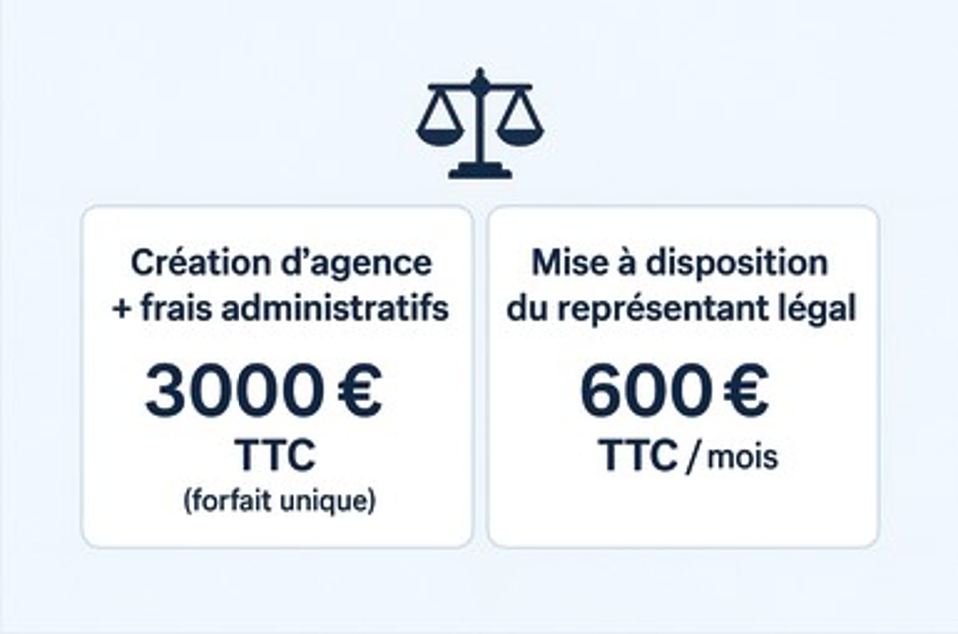 Pour l’ensemble des démarches nécessaires à l’ouverture de votre agence, prévoyez 3000€ TTC comprenant notre prestation et l'ensemble des frais administratifs ( hors capital social libérable) à intégrer dans vos charges comptables.